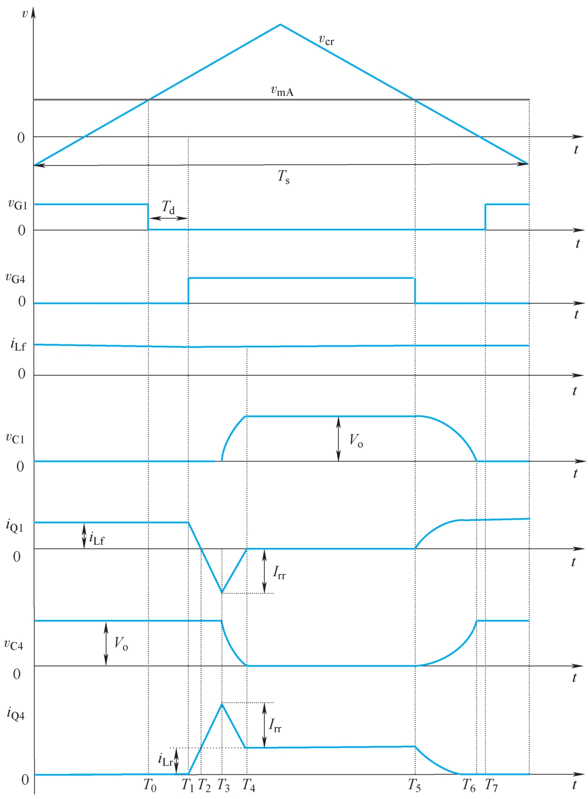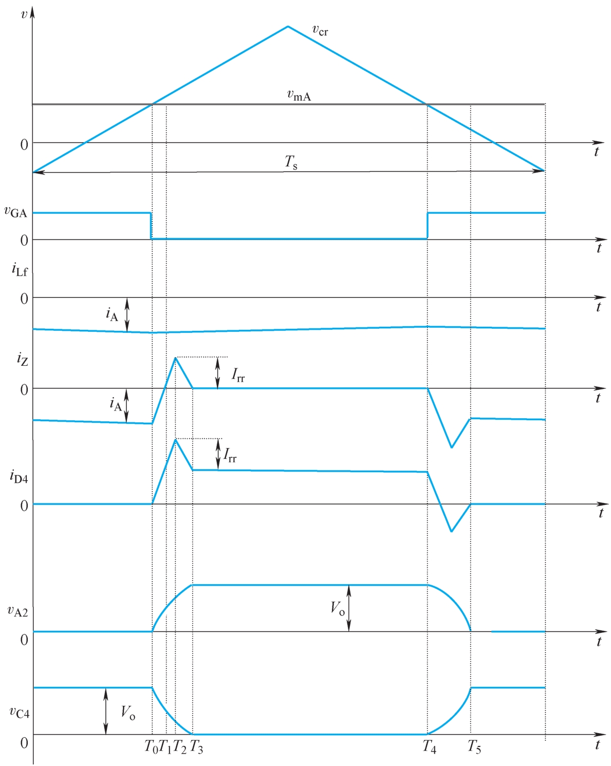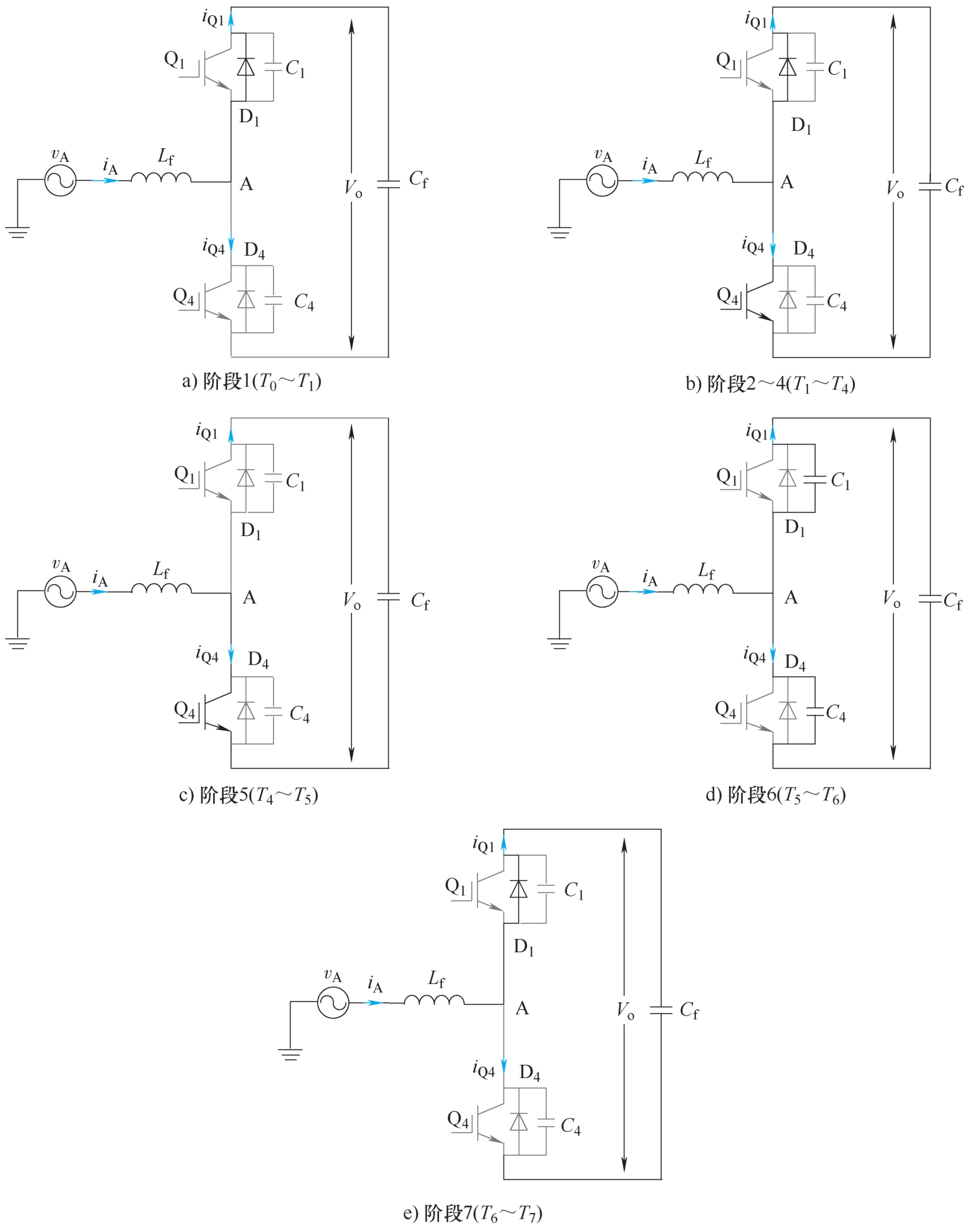 根据上述分析,A相桥臂下开关管Q 4 存在一个硬开通(D 1 向Q 4 换流),即只要在 t 1 时刻开通Q 4 ,二极管D 1 就会经历反向恢复过程;二极管D 1 的反向恢复电流不仅流经D 1 ,还流经开关Q 4 ,引起D 1 的反向恢复损耗和Q 4 的开通损耗,这个换流过程称为换流类型Ⅰ。 t 3 时刻,Q 4 关断,电感电流 i Lf 给电容 C 4 充电、给 C 1 放电,借助寄生电容 C 1 和 C 4 的缓冲作用,Q 4 实现零电压(ZVS)关断,这个换流过程称为换流类型Ⅱ。一般来讲,换流类型Ⅰ可引入软开关技术来消除或减小换流损耗。