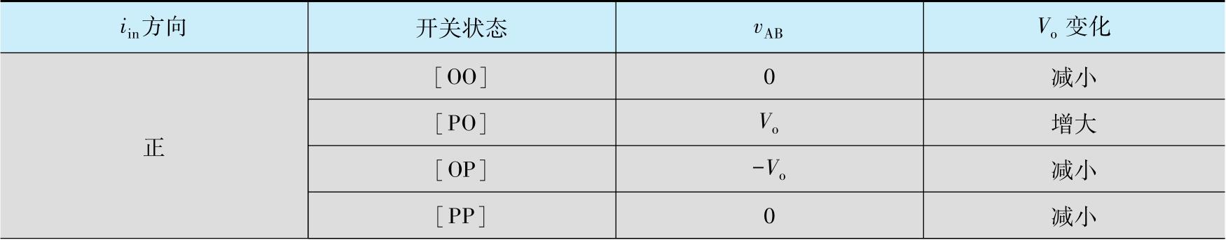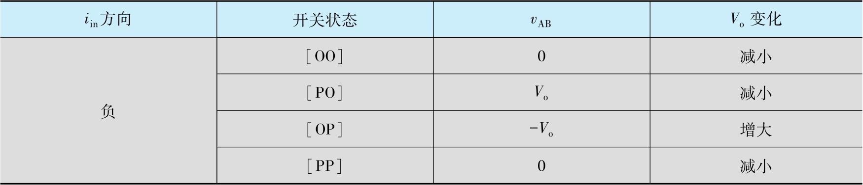 与之类似,当 i in 的方向为负时,可得到开关状态不同时直流侧电压 V o 的变化规律,总结见表2.2。