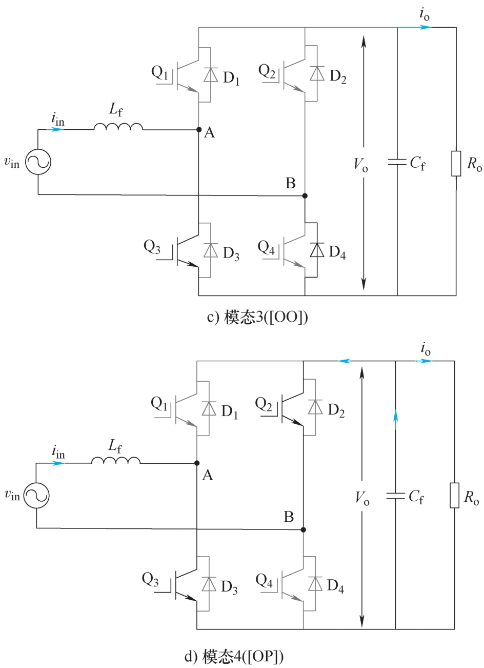 模态3 :对应开关状态[OO],如图2.14c所示,电压 v in 和电流 i in 反向。 i in 从Q 3 管流入经D 4 管返回,电感 L f 释能至交流侧。