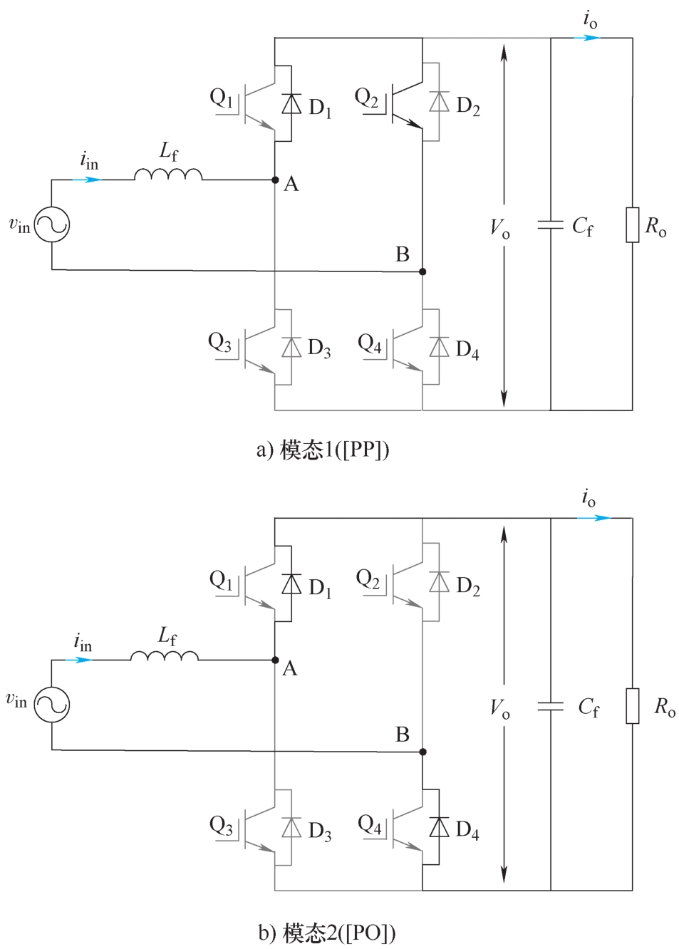 模态1 :对应开关状态[PP],如图2.14a所示,电压 v in 和电流 i in 同向。 i in 从D 1 管流入经Q 2 管返回,对电感 L f 储能;电容 C f 为负载 R o 供电,电容 C f 两端电压下降。