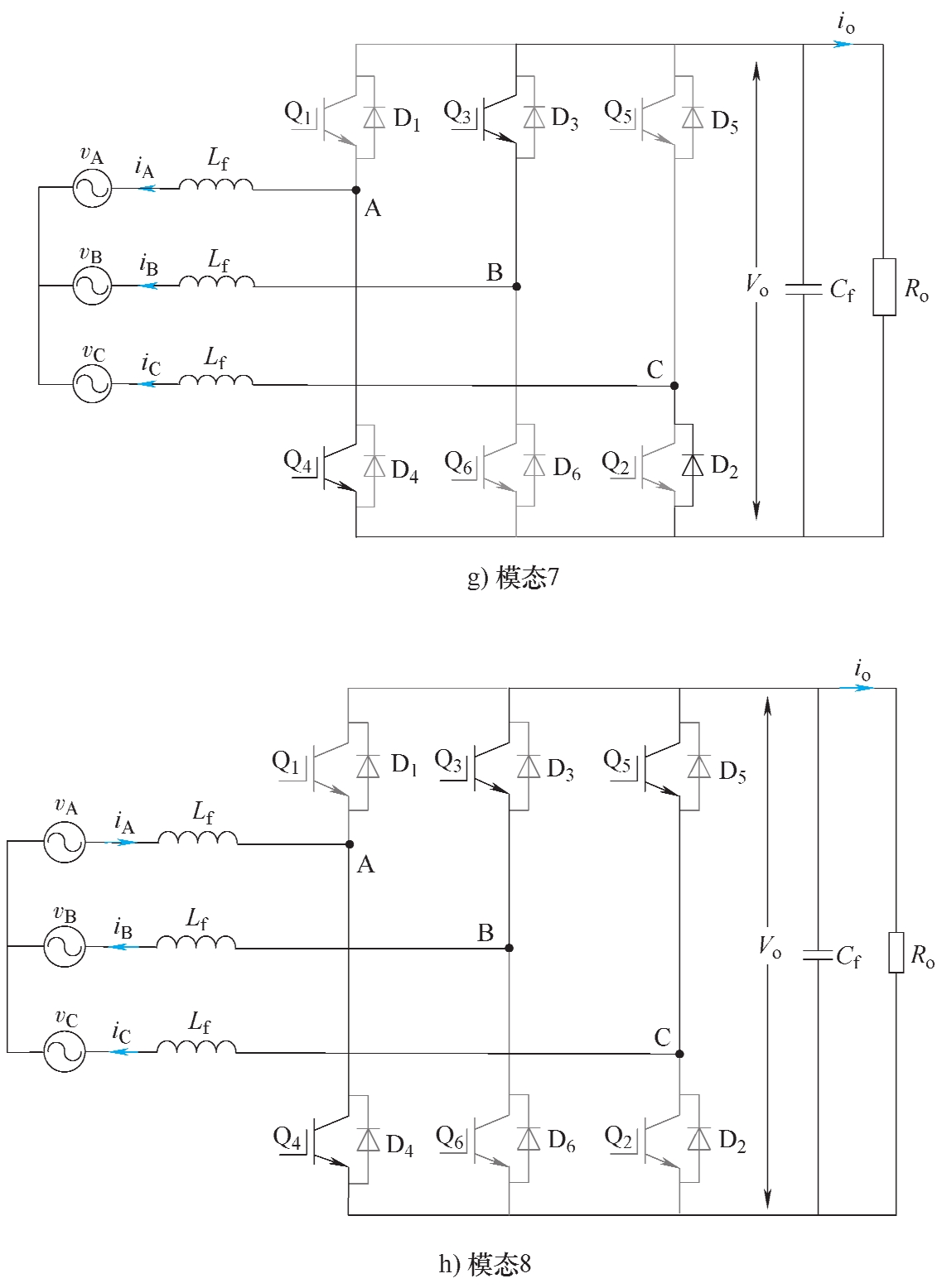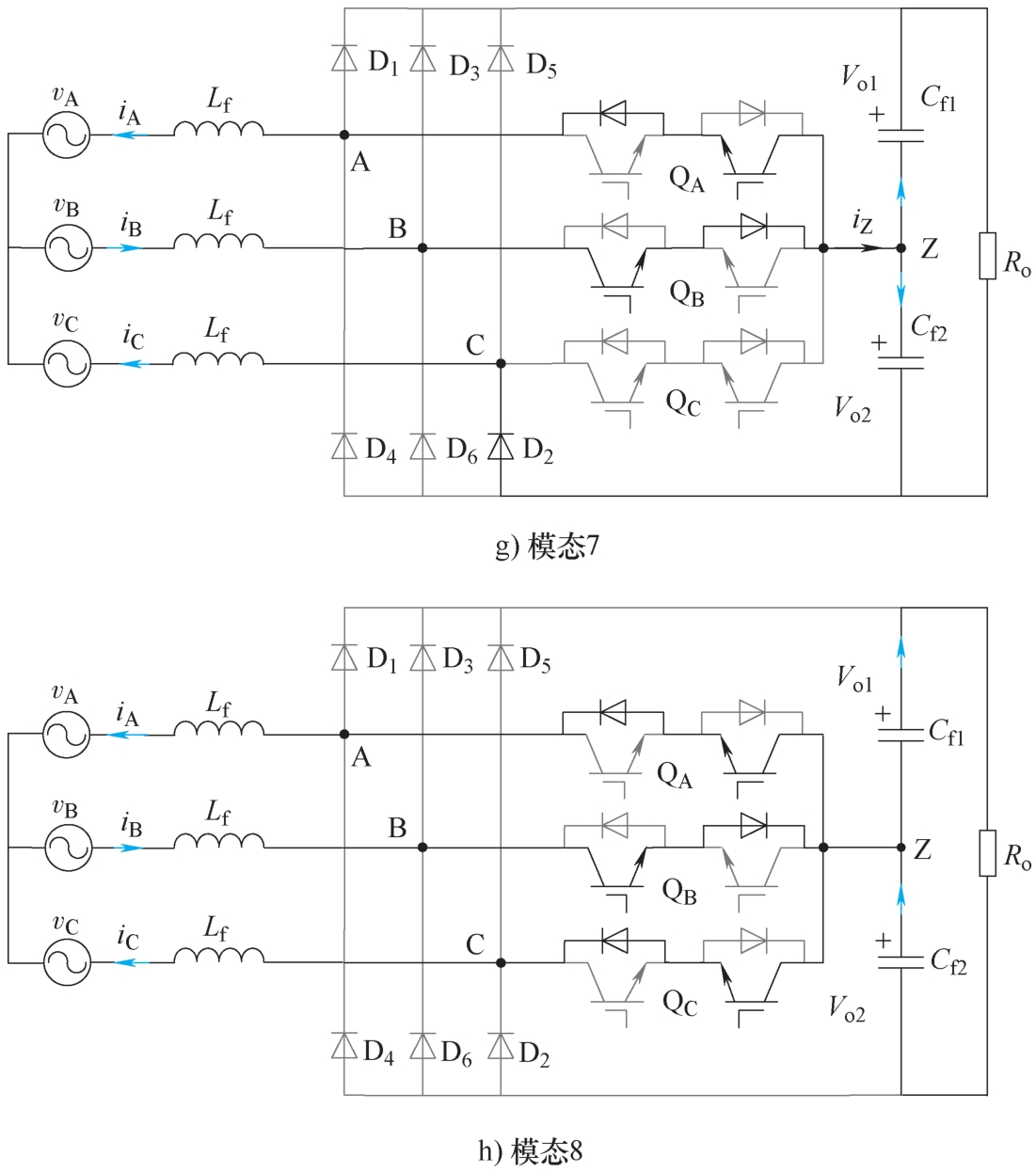 模态8 :对应图2.21h,此模态下Q A 、Q B 、Q C 均导通,有 v AZ =0、 v BZ =0、 v CZ =0。同时,电容 C f1 、 C f2 同时对负载放电,但中点电压不变;由于 i A + i B + i C =0,使得 i Z =0。