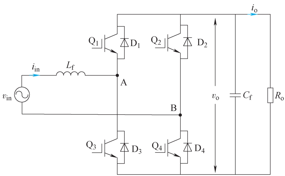 图2.12为单相全桥(H桥)电压源型PWM整流电路,也称为“功率因数校正器(Power Factor Correction, PFC)”,图中, v in 、 L f 和 i in 分别为整流电路的交流电源电压、交流侧集总电感以及交流电流; v o 、 i o 和 C f 分别为直流侧电压、电流以及电容,直流侧电容 C f 用以滤波和储能,从而使直流侧输出呈低阻抗的电压源特性。