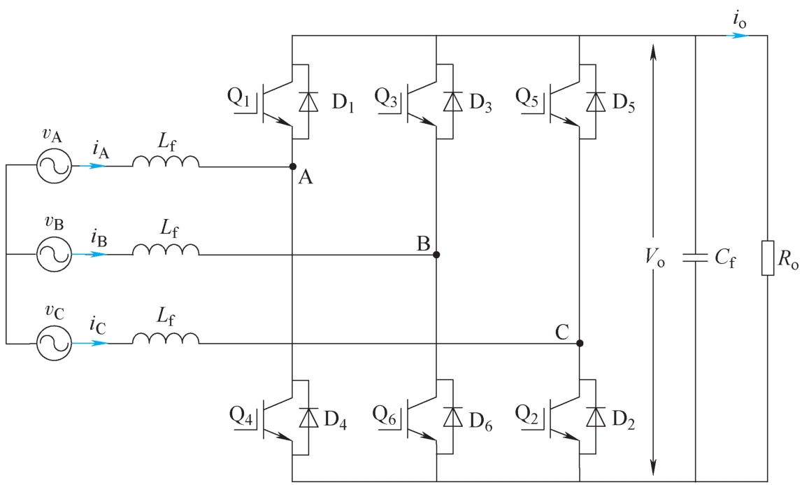 图2.15所示为最基本的三相全桥PWM整流电路,其应用也最为广泛。交流侧电感 L f 具有平衡和抑制高次谐波电流的作用,使交流侧输入的电流正弦化。直流侧电容 C f 用以滤除直流电流中的高次谐波分量,减小直流侧纹波。