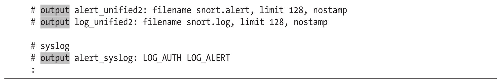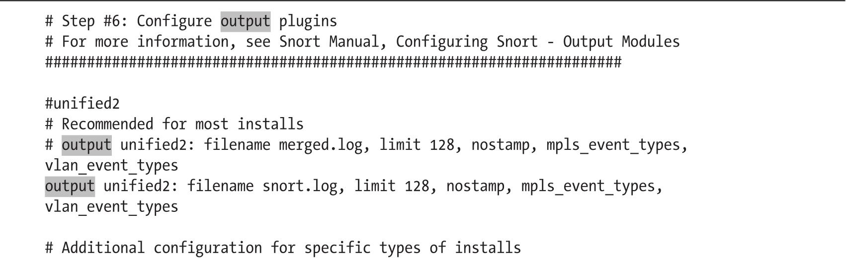 可以看到,less命令在屏幕的左下角显示了文件路径。如果按下正斜线(/)键,那么less将帮助你在文件中搜索词语。例如,当第一次安装Snort系统时,你可能需要确定希望以何种方式往何处发送入侵警告输出。要查找配置文件的相关部分,你可以直接搜索output,如下: