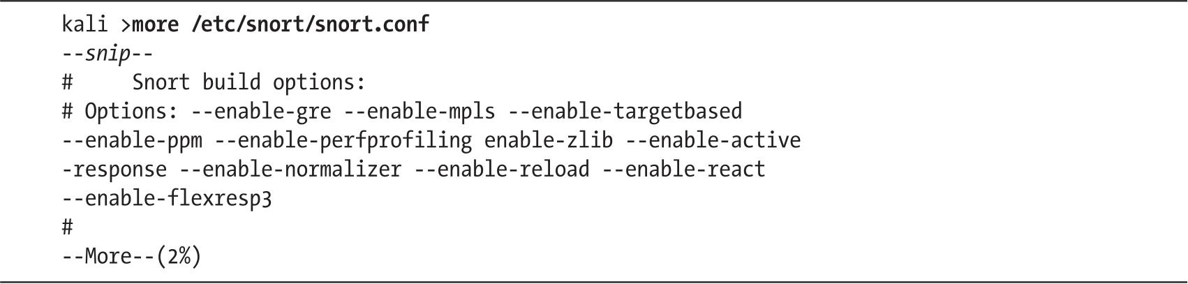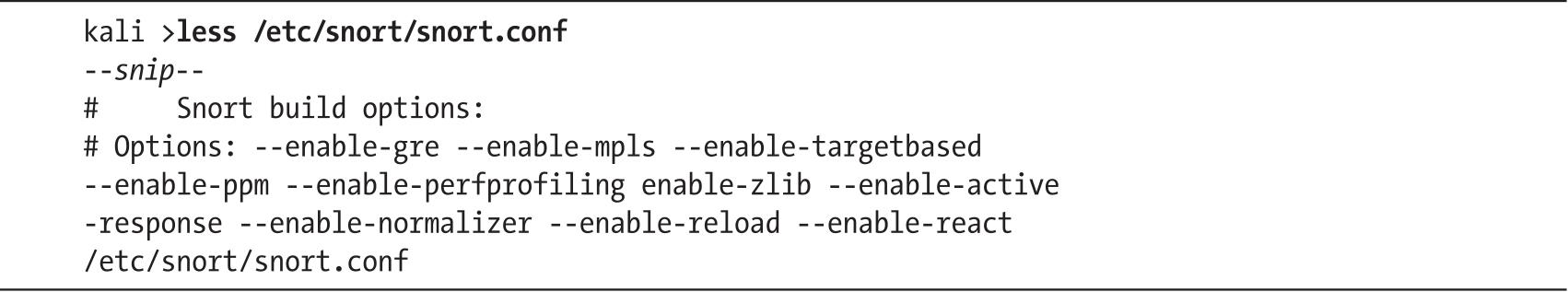 more命令一次显示文件的一页内容,然后利用回车(ENTER)键进行翻页。它是参考页面所使用的工具,因此我们首先学习该命令。利用more命令打开snort.conf,如代码清单2-7所示。