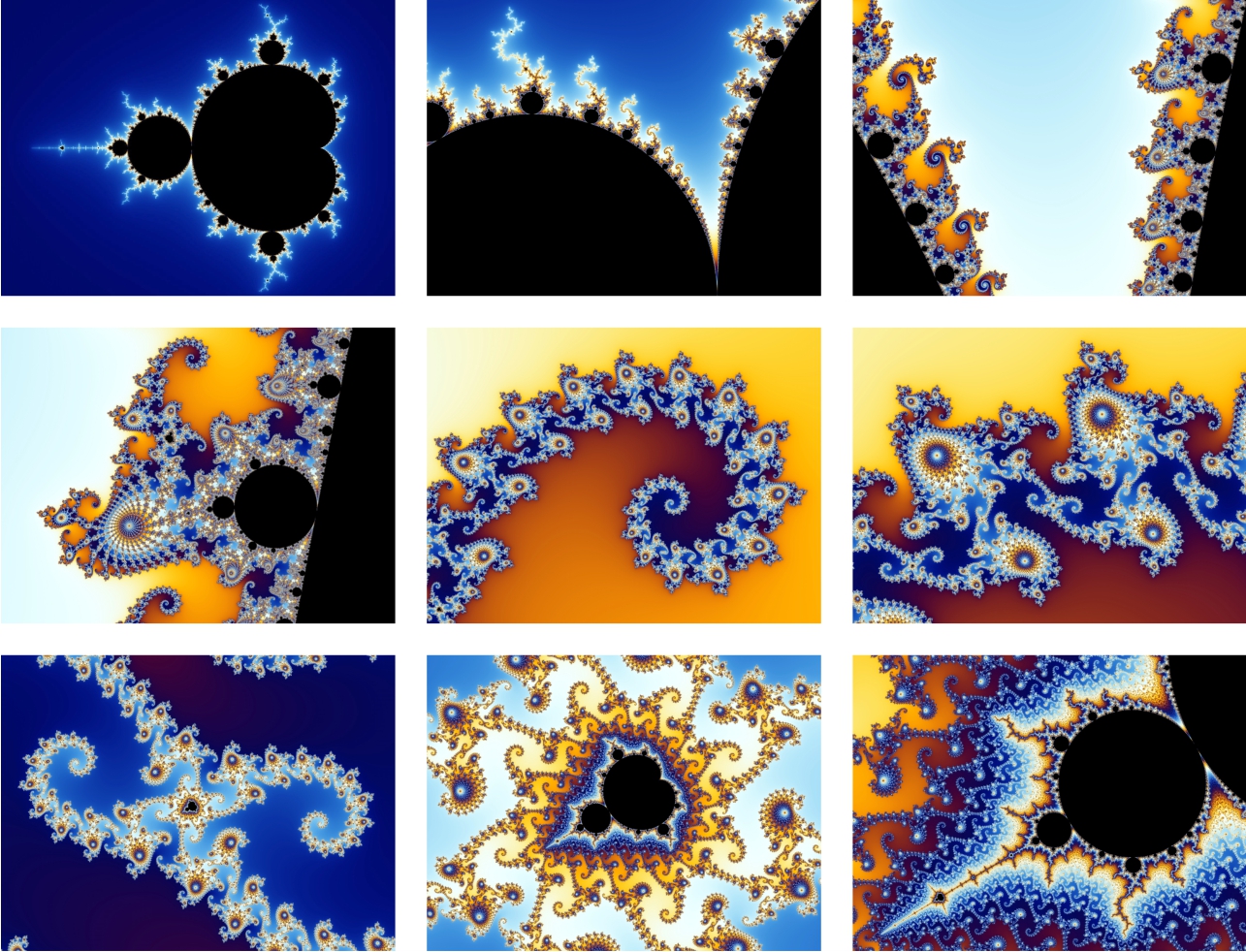 曼德尔布罗特集合的定义非常简单,但其产生的结构极为复杂,无论放大多少倍,都能发现它仍然包含着无限精细且自相似的细节,这也是分形图形最重要的特征。如果不借助计算机而仅凭人力,曼德尔布罗特集合几乎不可能被精确绘制。