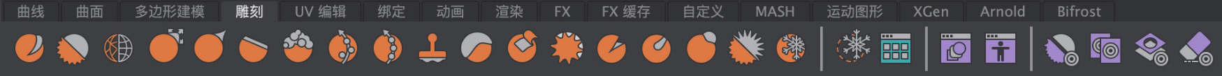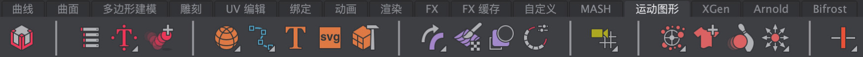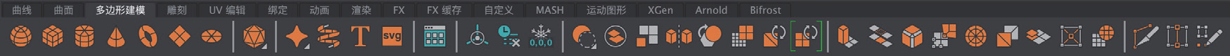 中文版Maya 2024的工具架根据命令的类型及作用分为多个标签来进行显示,其中,每个标签里都包含了对应的常用命令按钮。