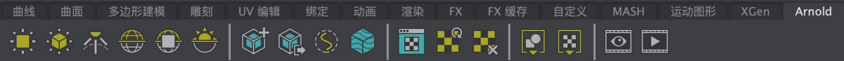 Arnold工具架主要由可以设置真实的灯光及天空环境的相关工具按钮组成,如图1-26所示。