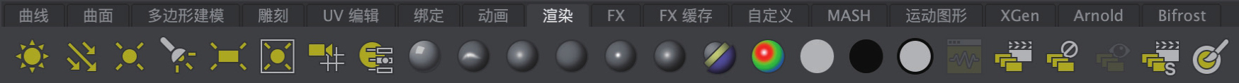 “渲染”工具架主要由可以设置灯光、材质以及渲染的相关工具按钮组成,如图1-20所示。