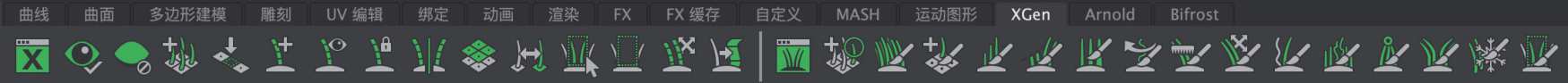 XGen工具架主要由可以设置毛发的相关工具按钮组成,如图1-25所示。