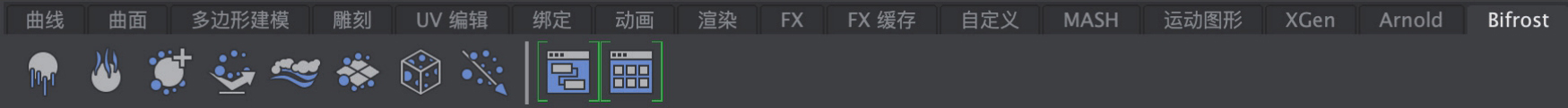 Bifrost工具架主要由可以设置流体动力学的相关工具按钮组成,如图1-27所示。