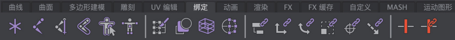“绑定”工具架主要由可以对角色进行骨骼绑定以及设置约束动画的相关工具按钮组成,如图1-18所示。