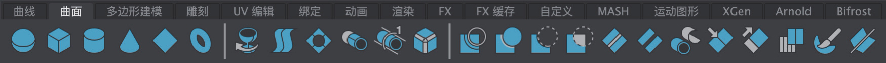 “曲面”工具架主要由可以创建曲面及修改曲面的相关工具按钮组成,如图1-14所示。
