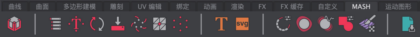 MASH工具架主要由可以创建MASH网络对象的相关工具按钮组成,如图1-23所示。