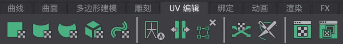 “UV编辑”工具架主要由可以设置多边形贴图坐标的相关工具按钮组成,如图1-17所示。