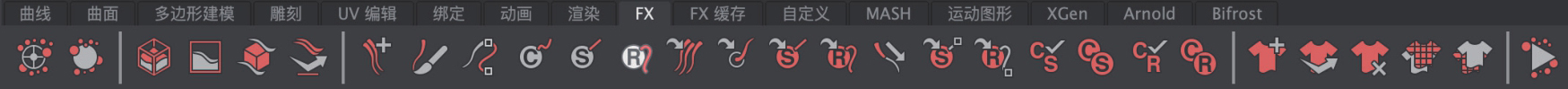 FX工具架主要由可以设置粒子、流体及布料动力学的相关工具按钮组成,如图1-21所示。