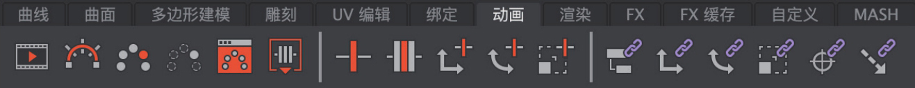 “动画”工具架主要由可以制作动画及设置约束动画的相关工具按钮组成,如图1-19所示。