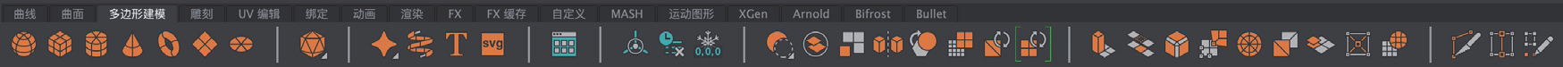 中文版Maya 2024提供了多种多边形基本几何体编辑工具,在“多边形建模”工具架中可以找到这些工具按钮,如图3-3所示。