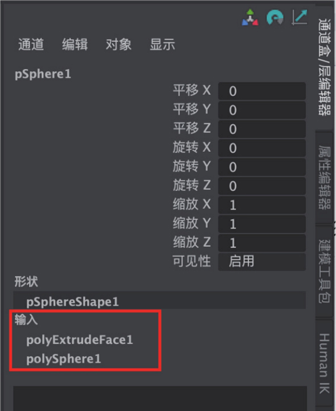09 在“通道盒/层编辑器”面板中的“输入”组内,可以查看为球体模型添加的操作命令,如图3-16所示。