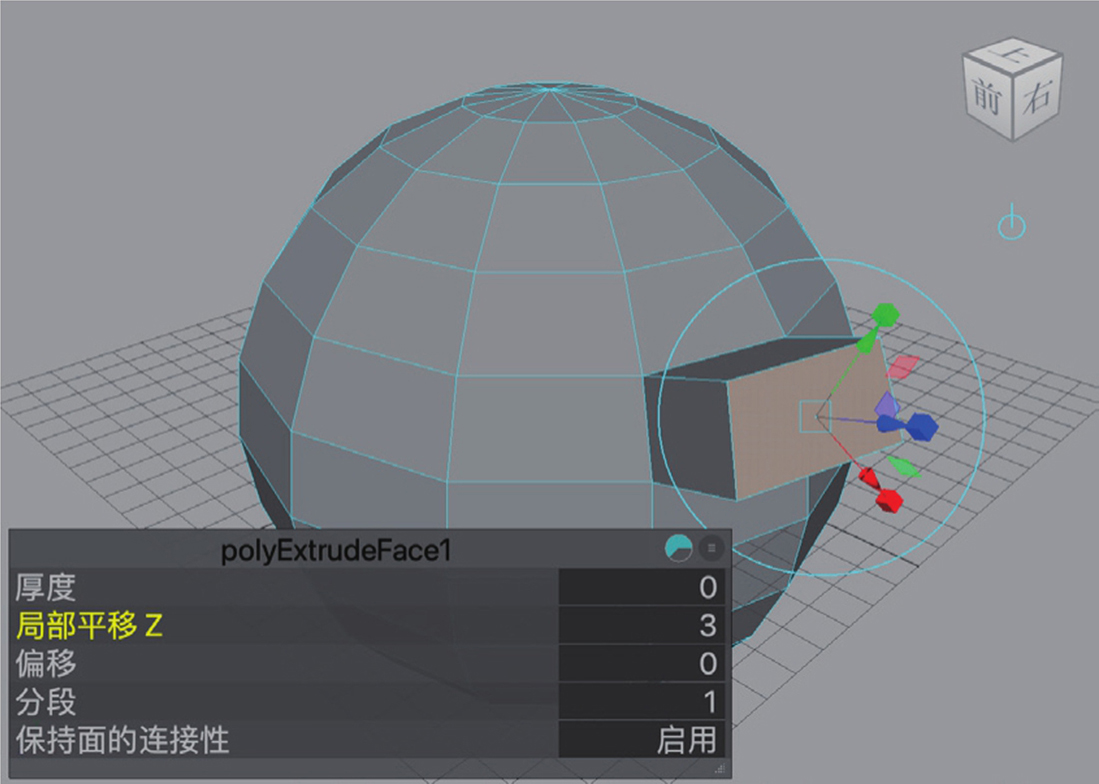 07 单击“多边形建模”工具架中的“挤出”按钮,如图3-13所示。对选中的面进行挤出操作,制作出如图3-14所示的模型。