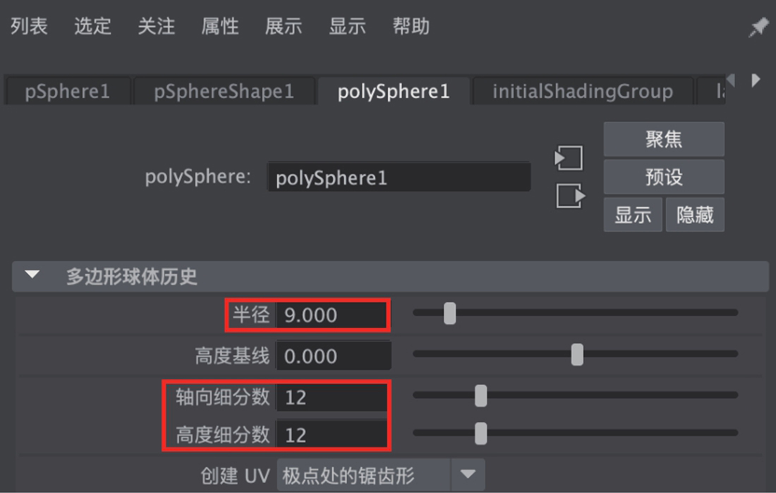04 在“属性编辑器”面板中,展开“多边形球体历史”卷展栏,更改“半径”值为9.000,“轴向细分数”值为12,“高度细分数”值为12,如图3-9所示。设置完成后,球体模型视图的显示结果如图3-10所示。