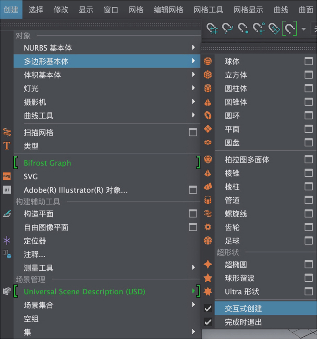 01 启动中文版Maya 2024,激活“创建”|“多边形基本体”|“交互式创建”命令,如图3-6所示。