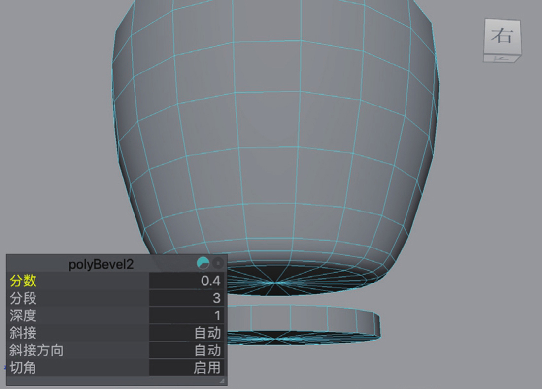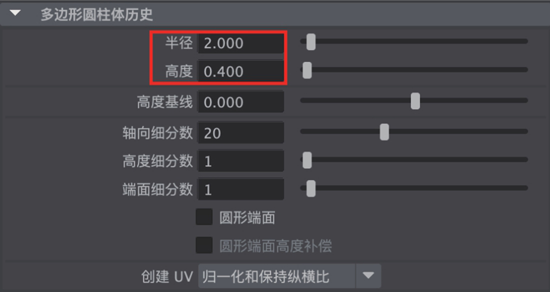 03 在“属性编辑器”面板中,展开“多边形圆柱体历史”卷展栏,设置“半径”值为2.000,“高度”值为0.400,如图3-47所示。