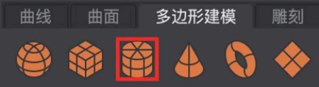 01 启动中文版Maya 2024,单击“多边形建模”工具架中的“多边形圆柱体”按钮,如图3-45所示。