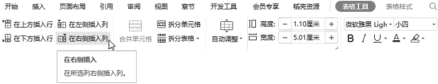 ②将光标定位于表格最右侧列单元格。在“表格工具”选项卡,点选“行和列”组中“在右侧插入列”按钮。如图2-73所示。在表格右侧添加一列。
