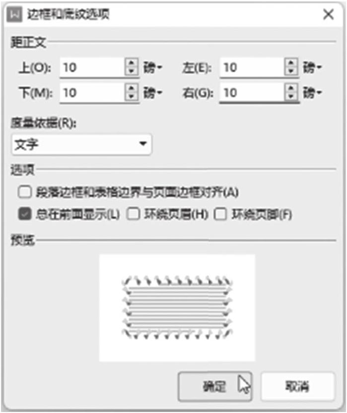 ⑥在“边框和底纹选项”对话框中,设置距正文上、下、左、右都为10磅。点击“确定”按钮。如图2-70所示。