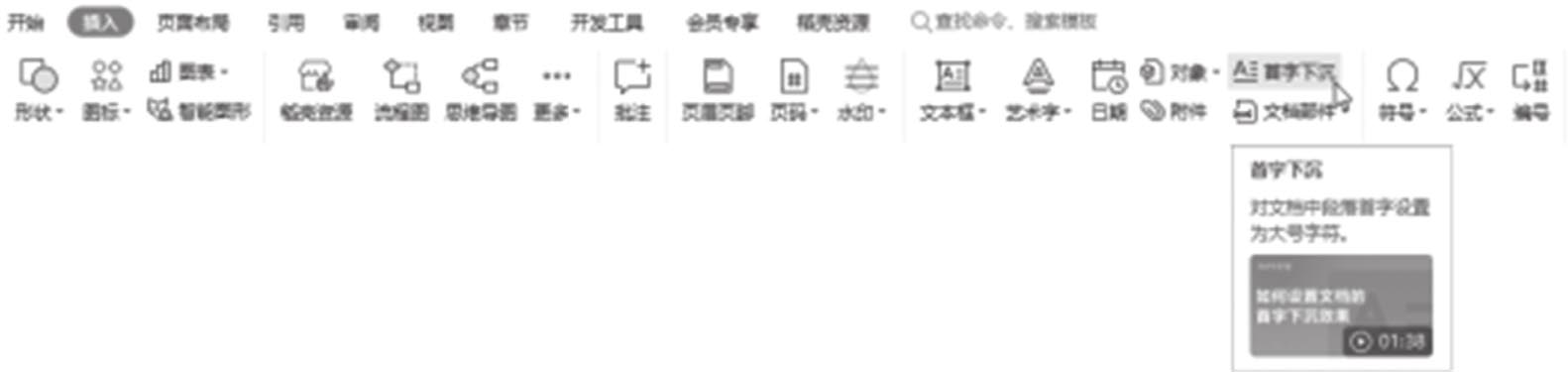 ①将光标定位于文档中第一段文本。在“插入”选项卡,点击“文本”组“首字下沉”按钮。如图2-71所示。