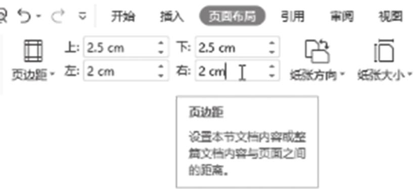⑤在“页面布局”选项卡的“页面设置”组中,设置上、下、左、右页边距分别为2.5cm、2.5cm、2cm、2cm。如图2-65所示。
