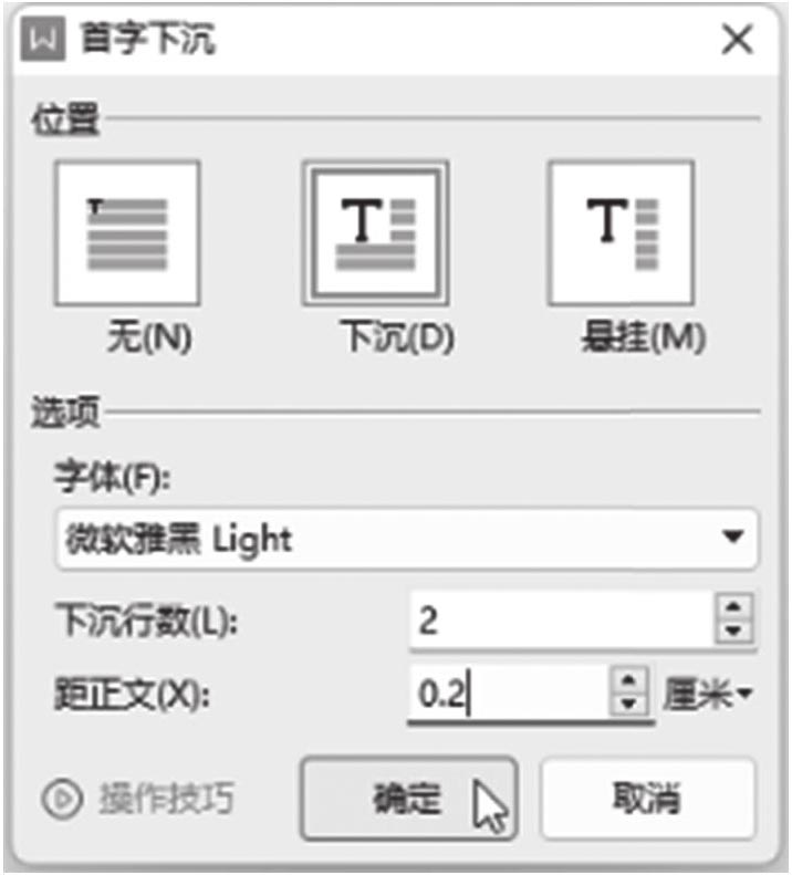 ②在“首字下沉”对话框中,设置下沉行数为“2”,距正文“0.2”厘米,然后,点击“确定”按钮。如图2-72所示。