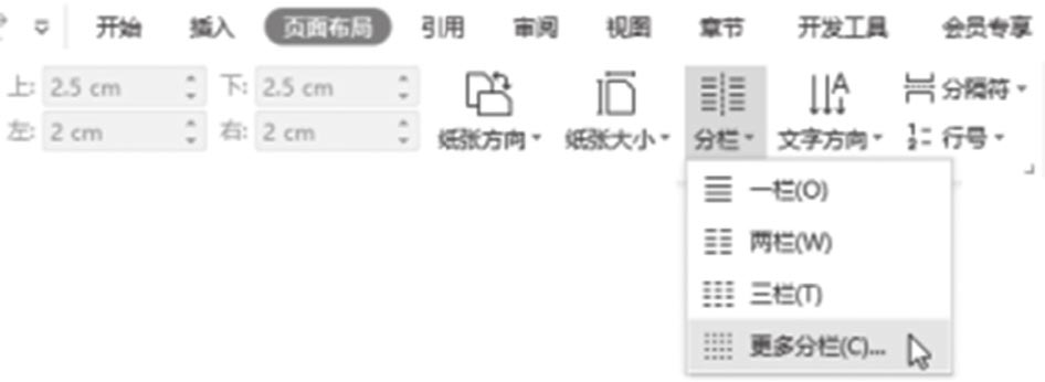①选中所有文本,在“页面布局”选项卡,点击“页面设置”组“分栏”下拉按钮,在选单中点选“更多分栏”。如图2-66所示。