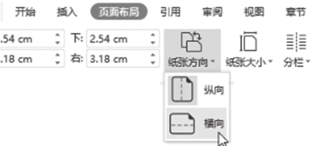 ②切换至“页面布局”选项卡,点击“页面设置”组“纸张方向”下拉按钮,在选单中点选“横向”。如图2-63所示。