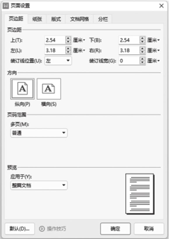 (1)页面设置 设置纸张方向、纸张大小、页边距、文字方向和文档网格等属性。一般情况下在文档排版之初进行相关设置。在“页面布局”选项卡中可完成页边距、纸张方向和纸张大小等常规选项设置。单击“页面设置”组右下角扩展按钮可打开“页面设置”对话框,进行详细设置。如图2-84所示。