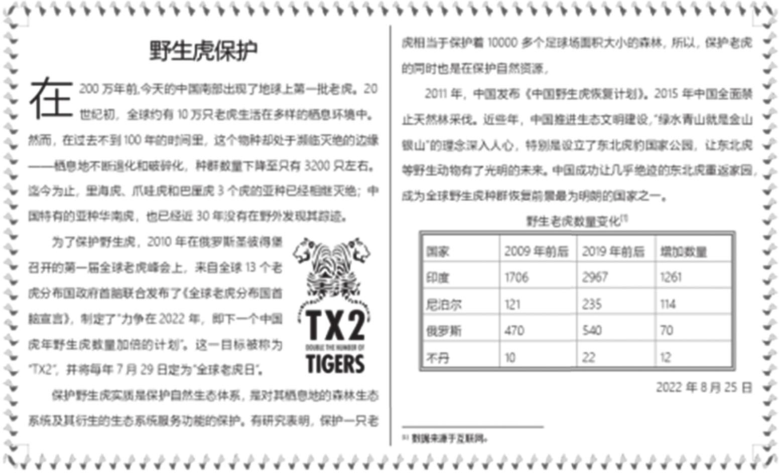 本任务以介绍野生虎保护文本、表格内容为例,介绍文档页面大小、页边距、页面方向、页面边框等设置;调整表格结构、设置表格样式、计算表格数据;脚注、日期插入等操作。文档完成后的效果如图2-62所示。