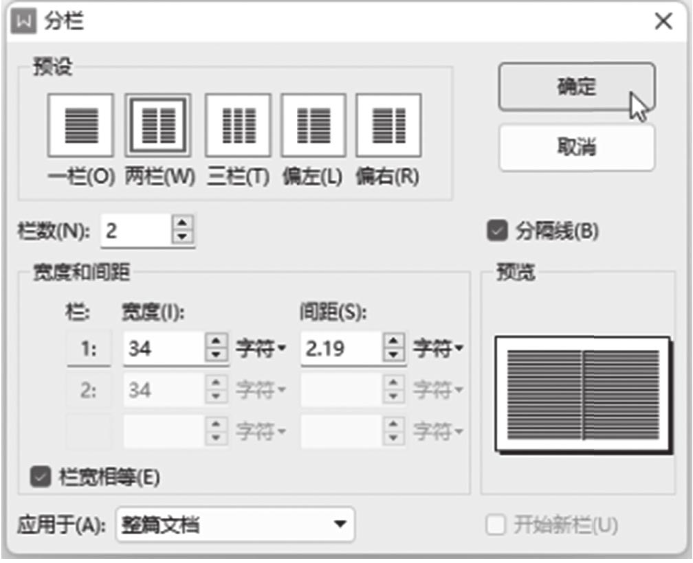 ②在“分栏”对话框中,设置“两栏”、栏宽“34”字符,勾选“分隔线”复选框。然后点击“确定”按钮。如图2-67所示。