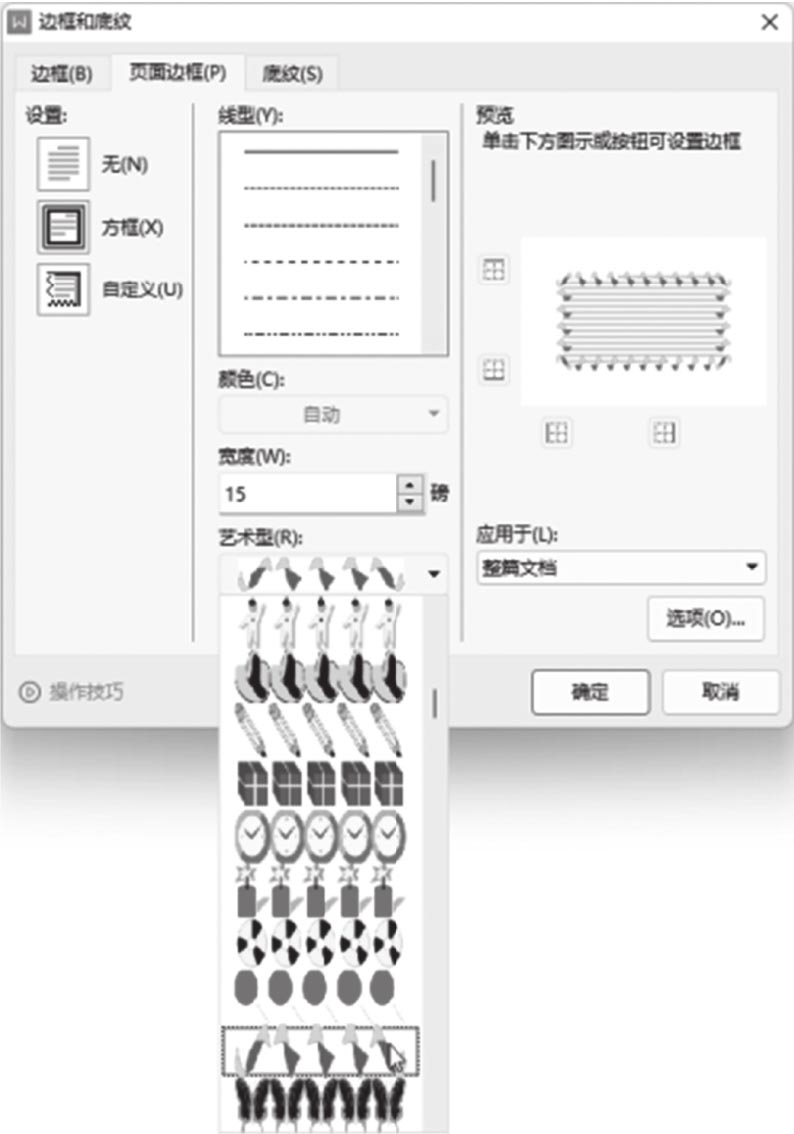 ④在“边框和底纹”对话框“页面边框”选项卡中,点击“艺术型”下拉按钮,在选单中点选指定的边框样式;设置边框宽度为“15”磅。如图2-69所示。