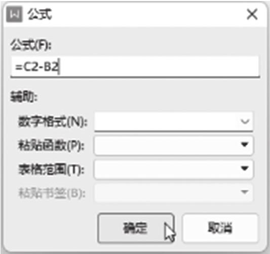 ⑤在“公式”对话框中,在“公式”文本框输入“=C2-B2”(C2表示“2967”所在单元格坐标,B2表示“1076”所在单元格坐标),点击“确定”按钮。如图2-75所示。