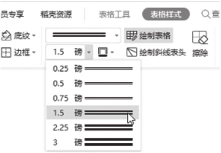 ④在“表格样式”选项卡“绘图”组中,点击“线型粗细”下拉按钮,在选单中选定“1.5磅”。如图2-77所示。