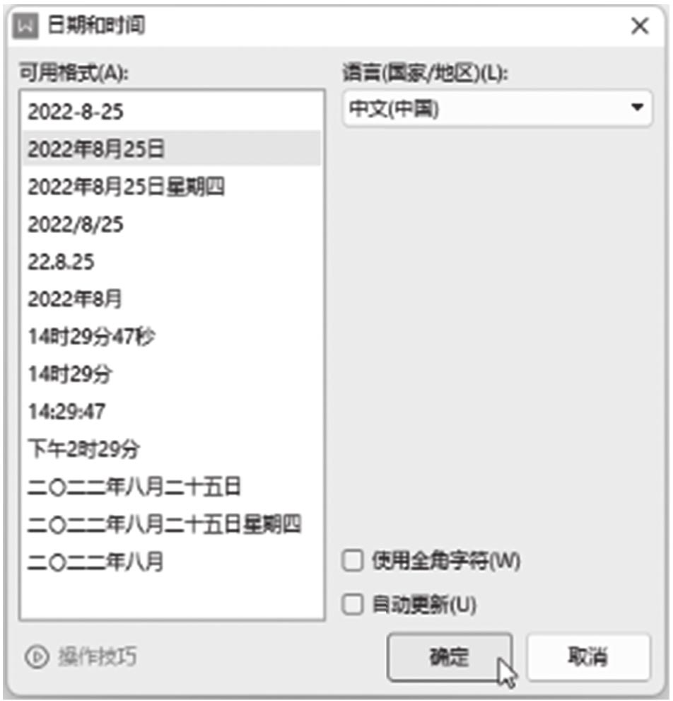 在文档中往往会使用当前的日期和时间。WPS文字可以自动在文档中插入系统当前的日期和时间。如:在输入系统中默认年份、月份后直接按【Enter】键,会自动补齐其余内容;也可在“插入”选项卡“文本”组中,单击“日期”按钮,打开“日期和时间”对话框,进行详细的设置,并可设置“自动更新”以及使用全角和半角等。
