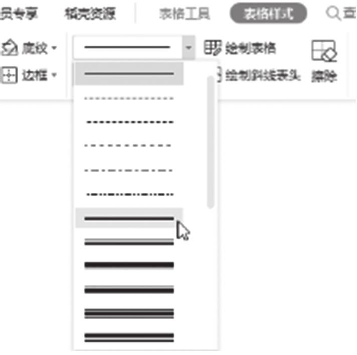 ③选中整个表格,在“表格样式”选项卡“绘图”组中,点击“线型”下拉按钮,在线型选单中点选指定的线型。如图2-76所示。