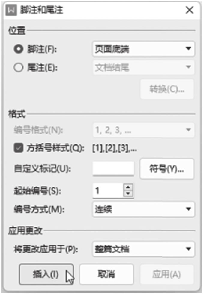⑤在“脚注和尾注”对话框中,确认选中“脚注”单选按钮,位置在“页面底端”;选中“方括号样式”复选框,点击“插入”按钮。如图2-83所示。