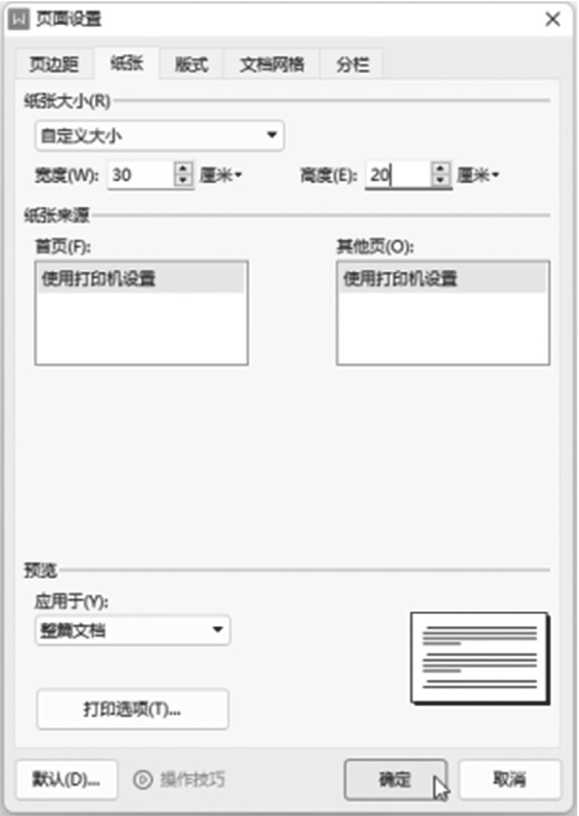 ④在弹出的“页面设置”对话框的“纸张”选项卡中,设置宽度为30厘米,高度为20厘米。然后点击“确定”按钮。如图2-64所示。