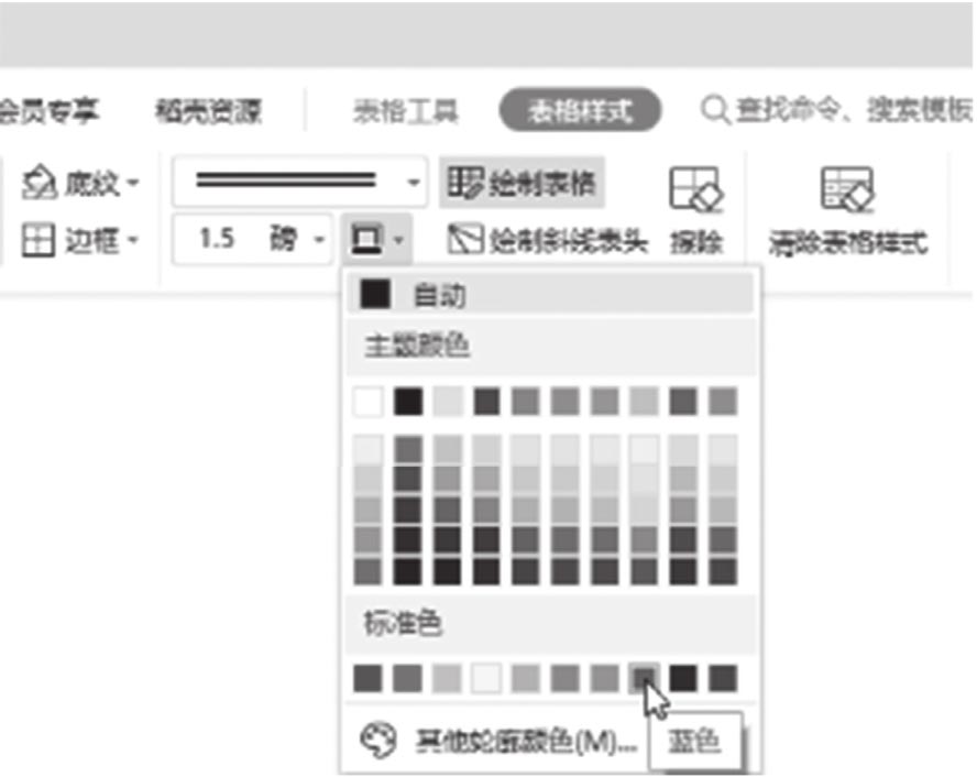 ⑤在“表格样式”选项卡“绘图”组中,点击“边框颜色”下拉按钮,在选单中选定“蓝色”。如图2-78所示。