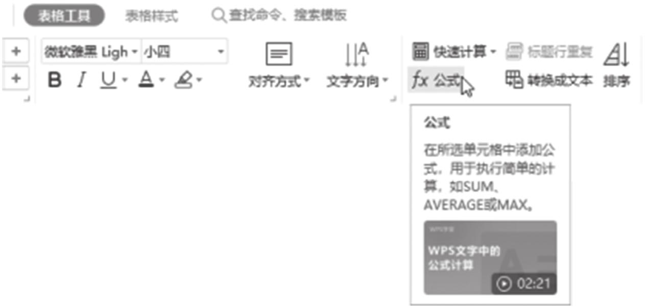 ④将光标定位于表格新增列第二行单元格中。在“表格工具”选项卡,点选“数据”组中“公式”按钮。如图2-74所示。