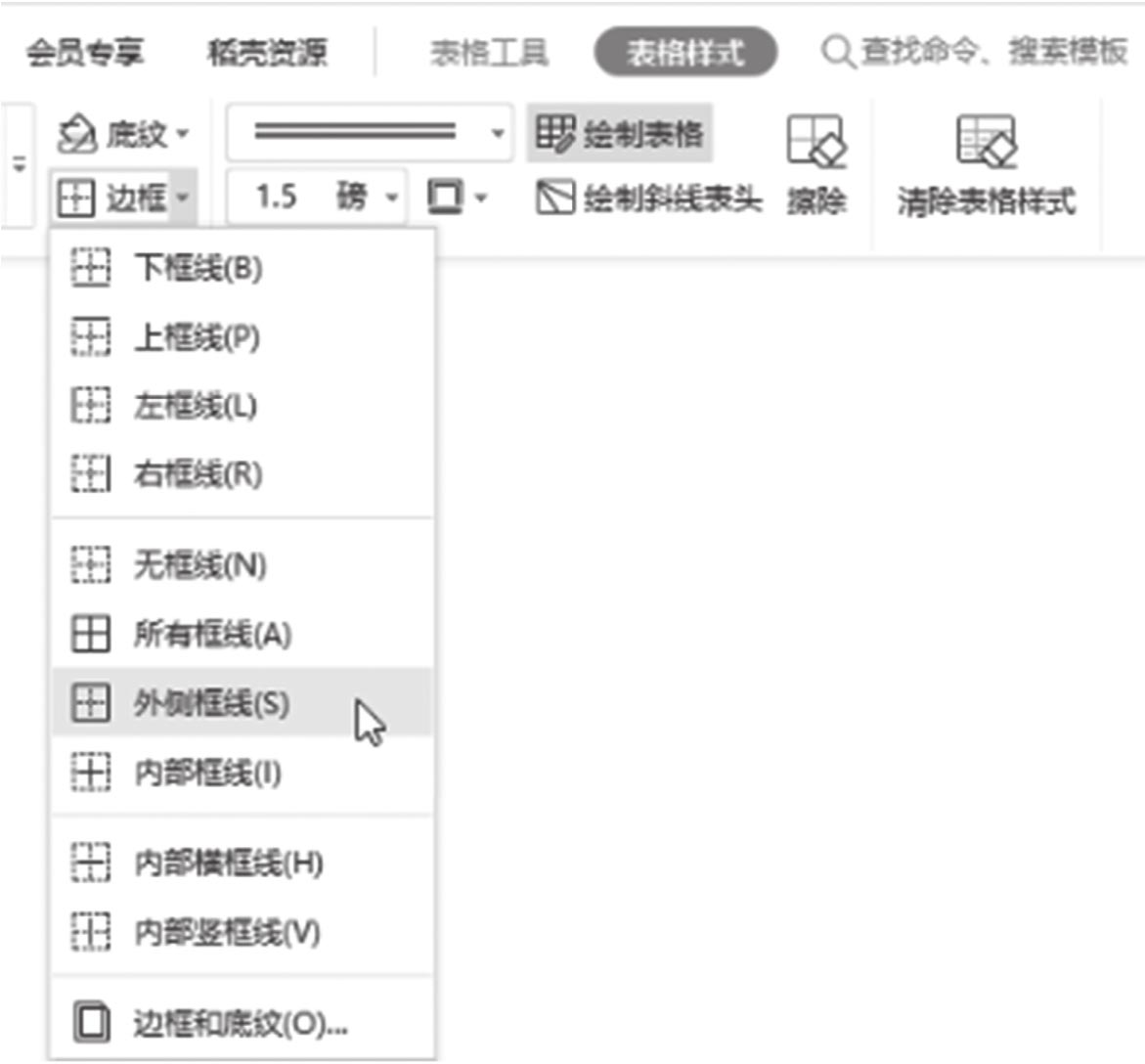 ⑥在“表格样式”选项卡“表格样式”组中,点击“边框”下拉按钮,在选单中选定“外侧框线”。如图2-79所示。