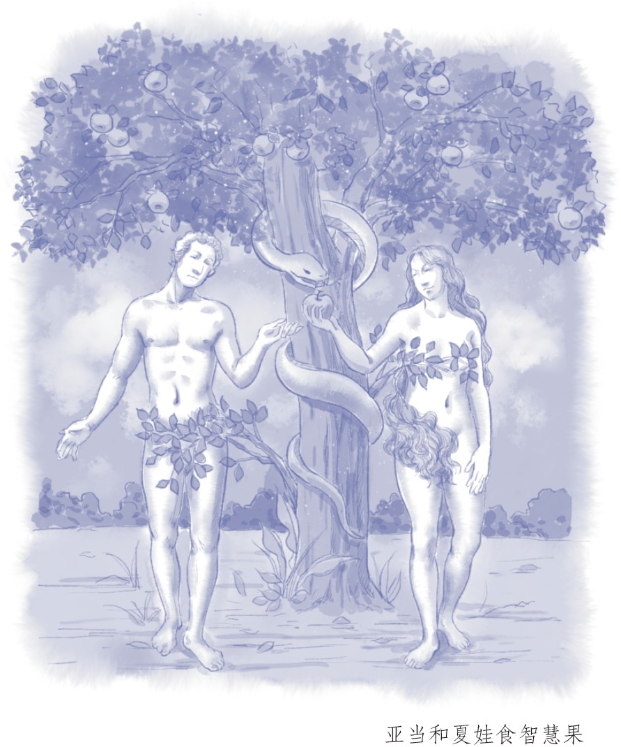 上帝创造了亚当和夏娃,把他们安置在伊甸园里。那里是地上的乐园,长满了各种各样的美丽果木,亚当和夏娃在里面生活得非常幸福。上帝给他们定了一个规矩,乐园里所有的果子都可以吃,唯独智慧树上的果子绝对不行,吃了就会死。