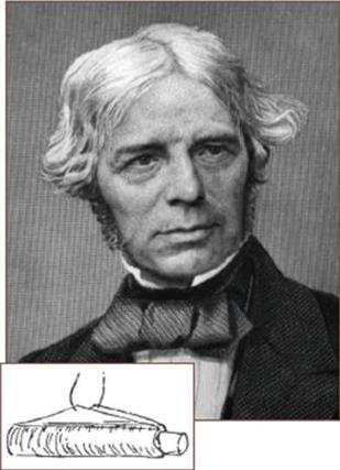 迈克尔 · 法拉第的蚀刻肖像。插入部分展示的是他在1831年10月17日的日记中的一 幅 图,这一天他发现了电磁感应现象。